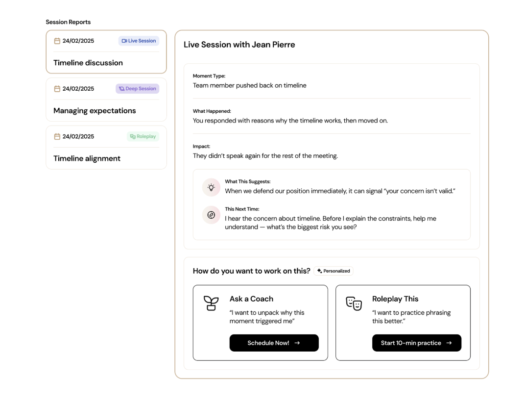 Session notes & sentiment auto-summarised for coach & coachee.